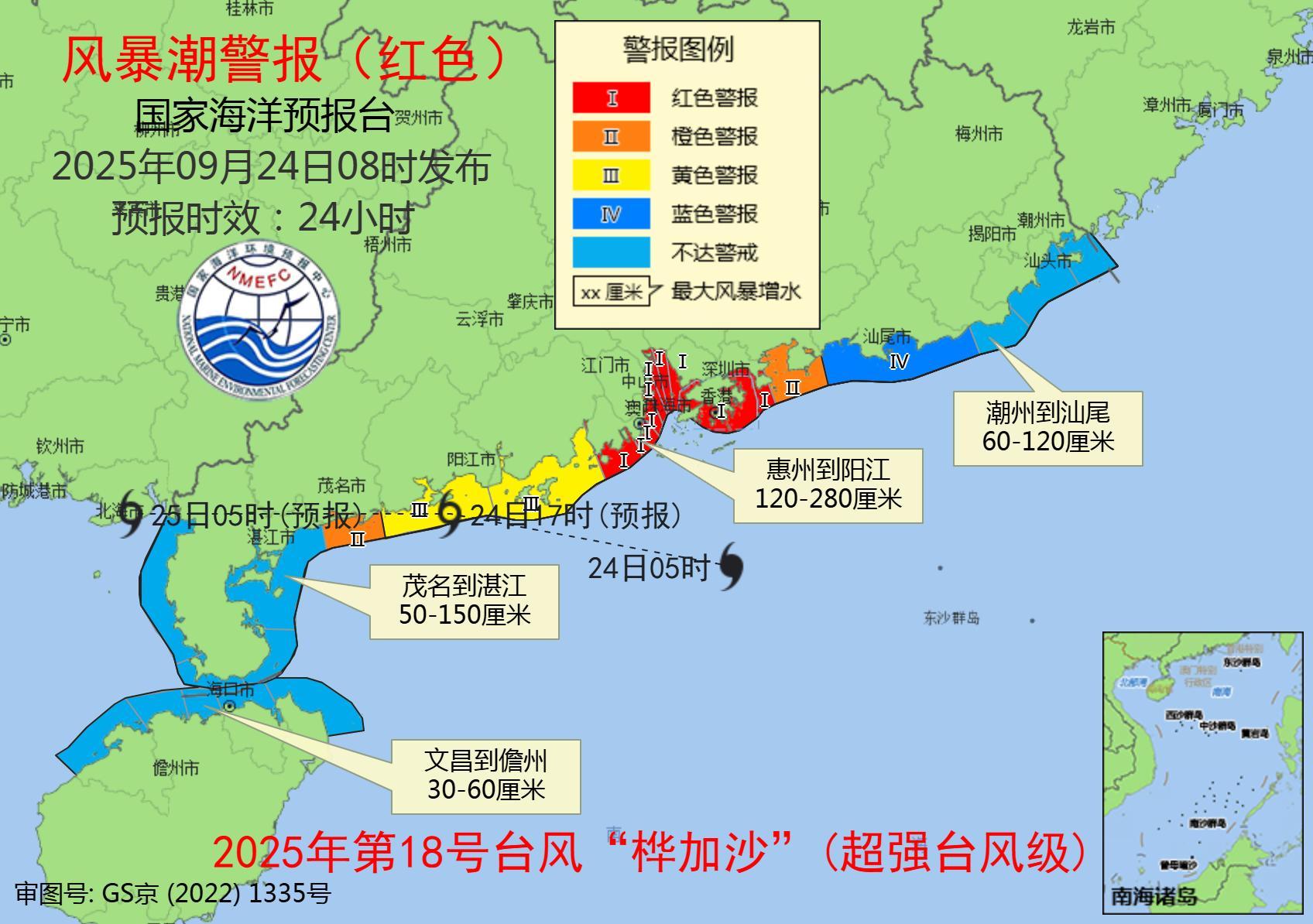 预计9月24日上午至25日上午,广东潮州到汕尾沿海将出现60到120厘米的风暴增水,广东惠州到阳江沿海将出现120到280厘米的风暴增水,广东茂名到湛江沿海将出现50到150厘米的风暴增水,海南儋州到文昌北部沿海将出现30到60厘米的风暴增水。
